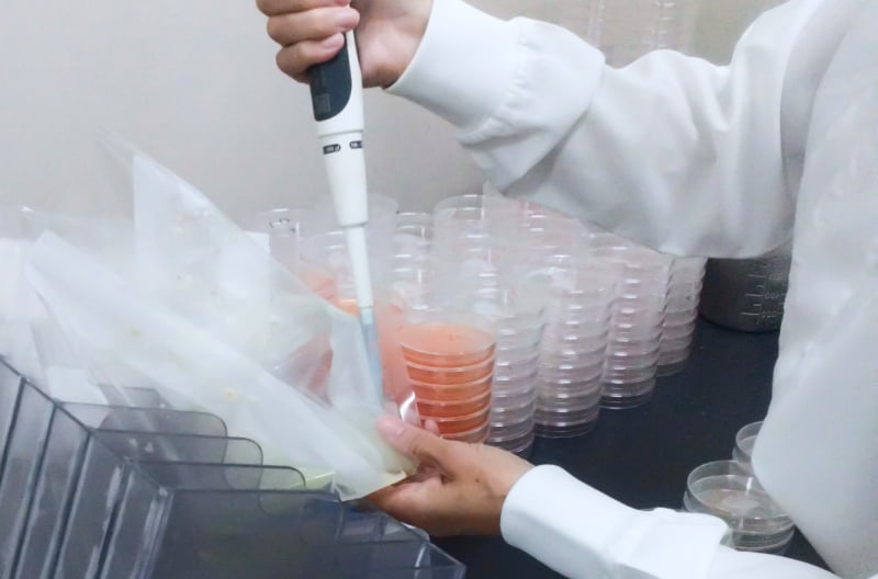 商品の検査だけではなく、食材が直接触れる器具類については、細菌の拭き取り検査を行って、清潔な状態で商品を製造しているか確認します。