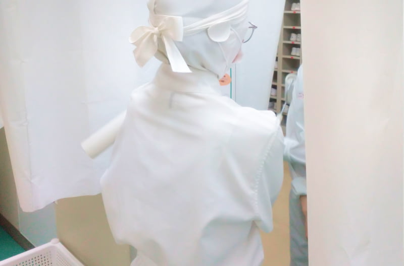 作業服についた毛髪などの付着物を、粘着ローラーで念入りに取り除きます。