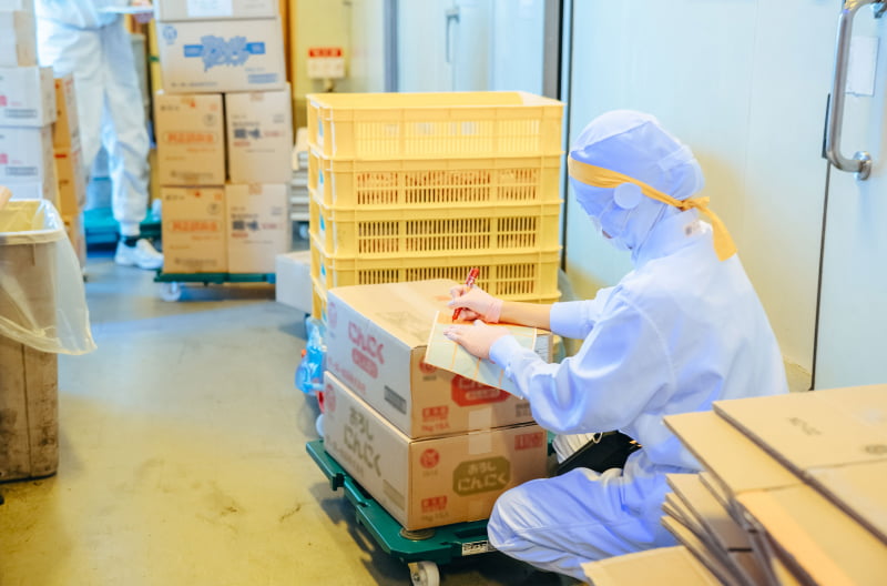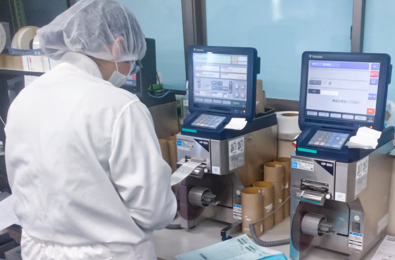 出来上がった商品は、検品専任者が、包装状態・盛り付け状態に加え、再度ラベル・シールが正しいかの確認を行います。