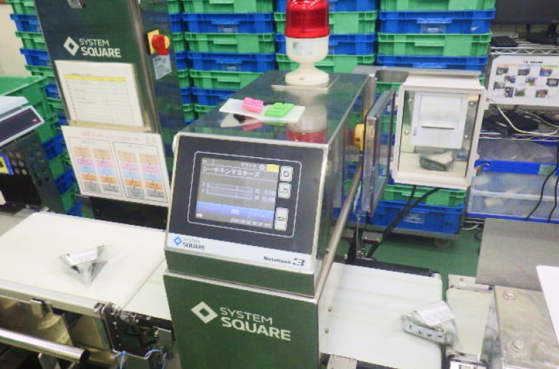 出来上がった商品は、全て金属探知機に掛けて確認します。