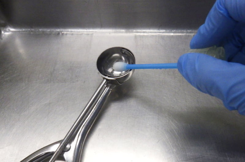 商品の検査だけではなく、食材が直接触れる器具類については、細菌の拭き取り検査を行って、清潔な状態で商品を製造しているか確認します。